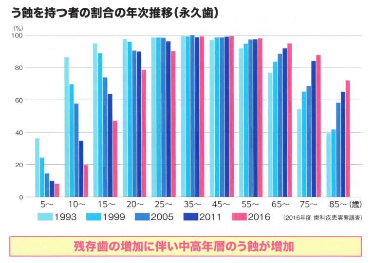 1993年と2016年を比べると明らかに幼少期の虫歯の割合は減少しています