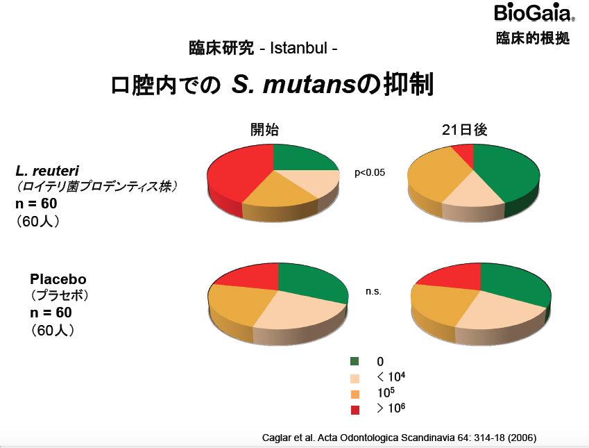 ロイテリ菌を摂取したグループと摂取していないグループ(プラセボ)と比較した研究では、ロイテリ菌を摂取したグループは虫歯菌(S.mutans)の数が抑制され、プラセボグループは虫歯菌の数に変化がありませんでした