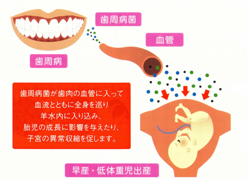 歯周病菌が歯肉の血管内に入って、血流とともに全身を巡り羊水内に入り込み、胎児の成長に影響を与えたり、子宮の異常収縮を促すと言われています