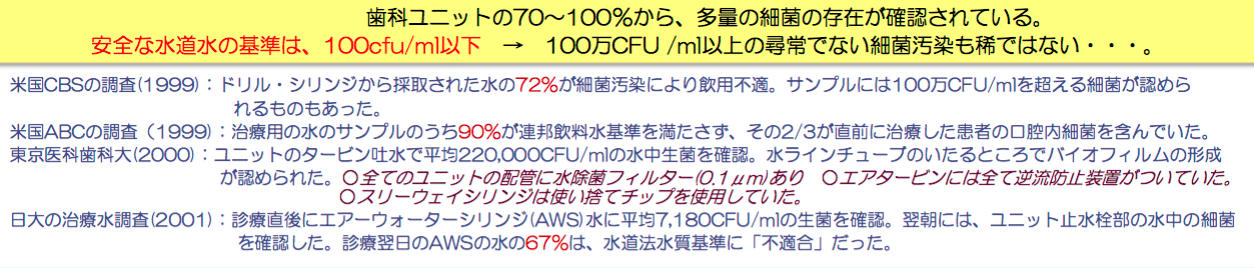 歯科施設で利用されている水道水は、通常の蛇口からの採取で細菌はほとんど存在せず、残留塩素濃度が4ppm以上に保たれてい ます。一方、この水道水を利用しているはずの歯科治療用ユニットの先端(治療器から出る水・うがい用の水・他)から採取した 水を調査すると、報告により70%~100%の割合で、安全な水道水の基準(100cfu/ml以下、1mlあたり細菌数は100個以下)を超える、多量の細菌の存在が確 認されています。